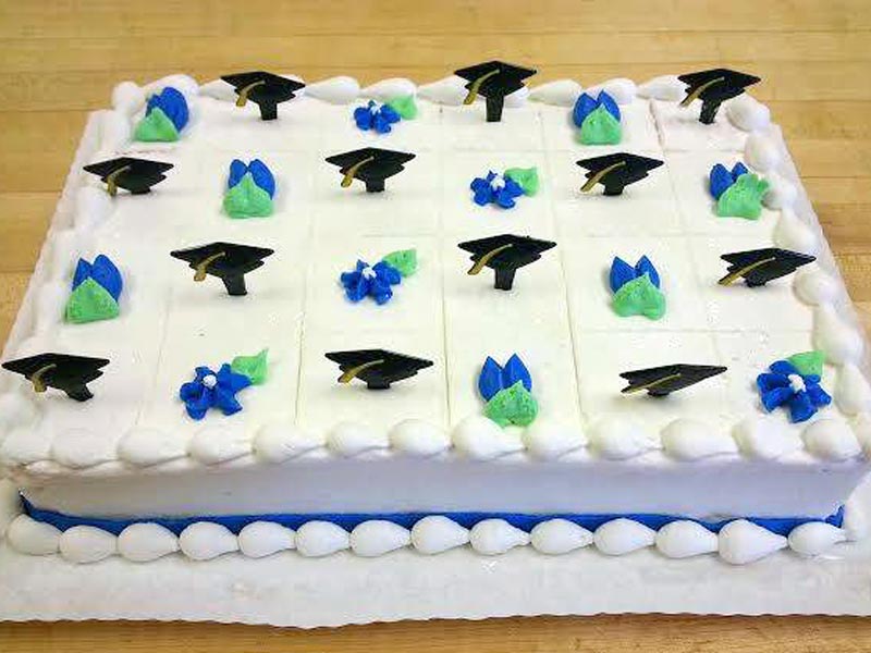 Our cake prices may vary depending on the decorations you choose. If you're watching costs, consider having a decorated centerpiece cake, with accompanying plain iced sheet cakes to serve from. Our cakes are decorated with our own buttercream frosting. If you have questions, feel free to stop in the store or give our decorators a call!